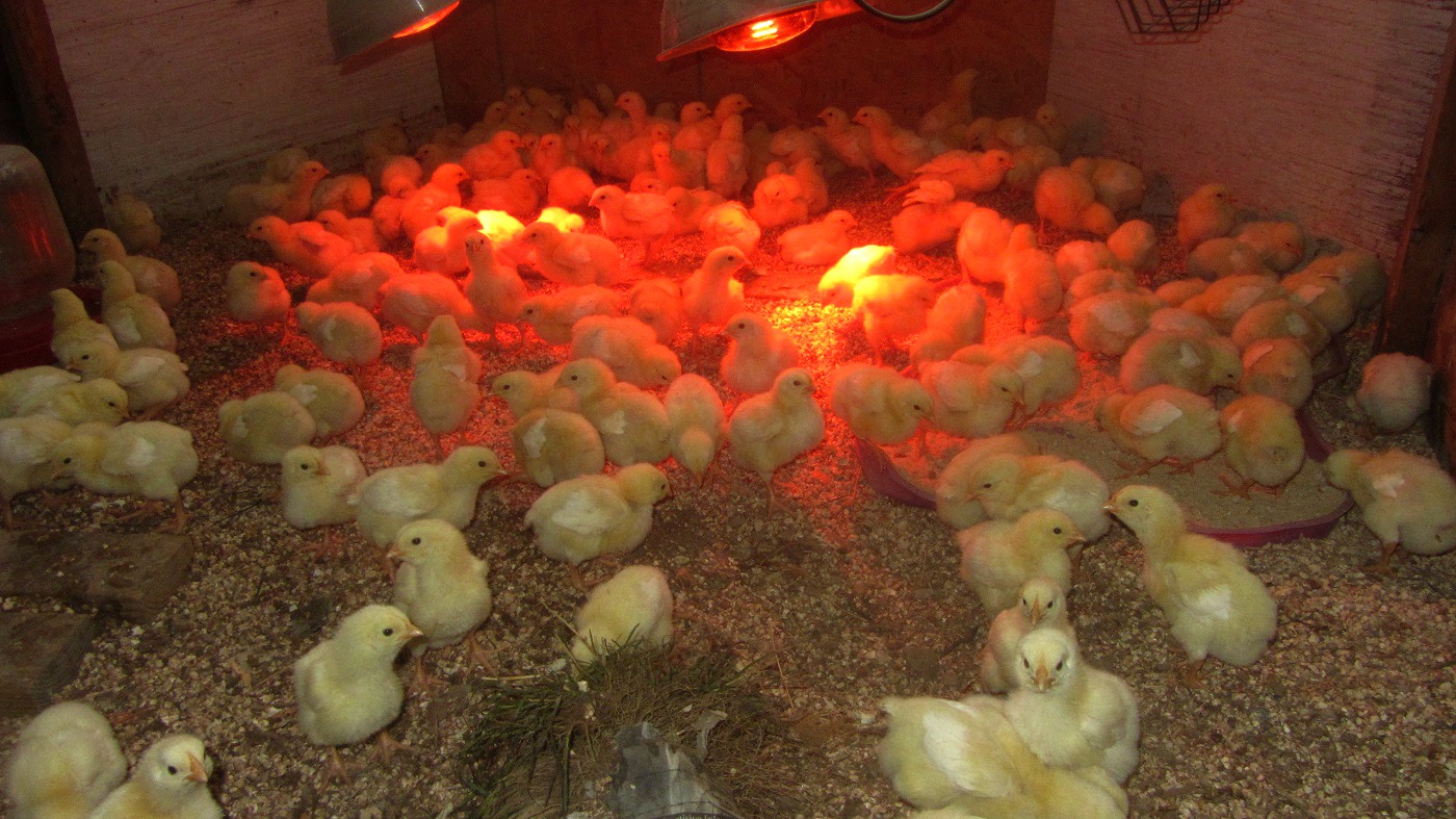 The broiler chicks spend their first two weeks in a warm, indoor area known as a brooder.